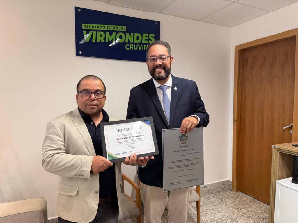 O presidente do Instituto Consciente, Felipe Inácio, esteve com o deputado estadual Virmondes Cruvinel para receber oficialmente a homenagem relacionada ao título de Utilidade Pública Estadual, concedido recentemente à instituição. Braço socioambiental da Consciente Construtora e Incorporadora, o Instituto atua com projetos nas áreas de educação, qualificação profissional, saúde e incentivo à cultura, com ações voltadas aos colaboradores e à comunidade. Na foto, o presidente do Instituto Consciente, Felipe Inácio, e o deputado estadual, Virmondes Cruvinel.