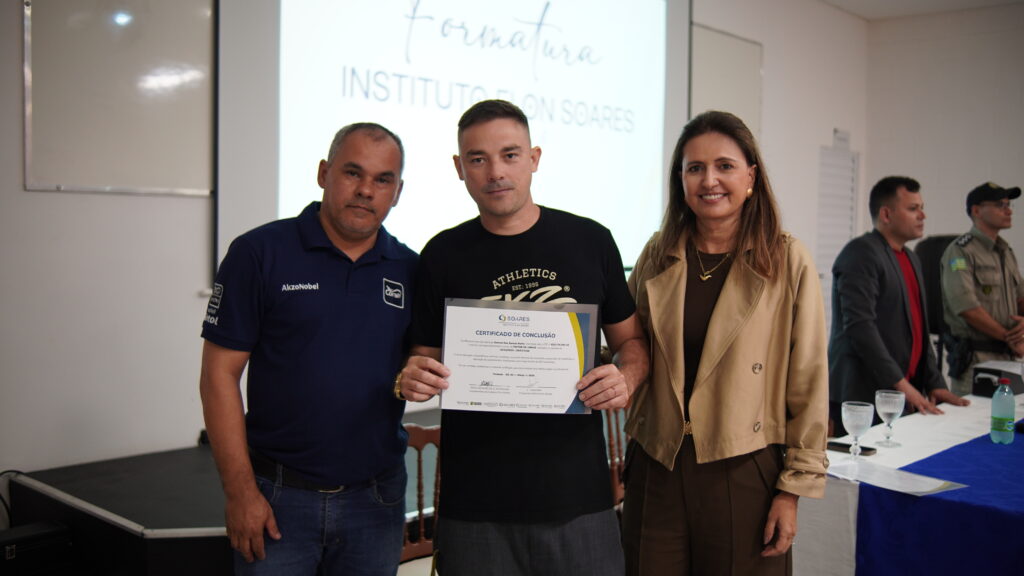O professor Oswaldo Serafim e a empresária Tânia Soares, conselheira do Grupo Soares, entregaram o certificado de conclusão do curso de pintor de obras ao aluno Samuel dos Santos, durante cerimônia realizada na sede do Instituto, em Trindade, Goiás. O curso, oferecido de forma gratuita, beneficiou 19 pessoas.