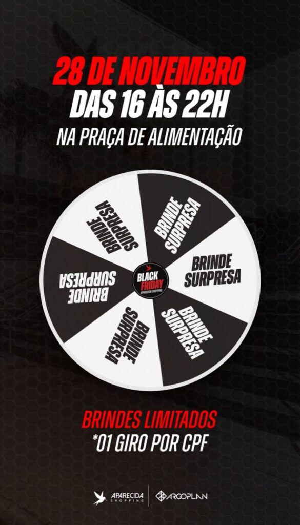 O Aparecida Shopping, conhecido como o shopping do coração de Aparecida de Goiânia, preparou uma ação especial para esta Black Friday. No dia 28 de novembro, clientes que realizarem compras a partir de R$ 100 poderão girar a roleta premiada uma única vez e garantir brindes exclusivos — em quantidades limitadas. A dinâmica acontece das 16h às 22h, na praça de alimentação, localizada no piso 2.